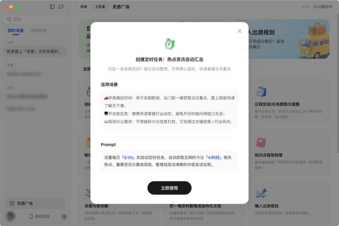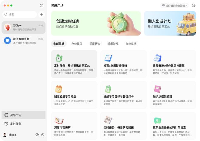 对于普通用户而言,除了部署门槛外,配置技能和编写指令也是“养虾”的一大挑战。为解决这一问题,QClaw新版本推出了“灵感广场”,围绕办公效率提升、深度研究、娱乐游戏、自律生活等典型场景,提供了近20个常用任务,用户点击“立即使用”即可运行技能,无需额外配置或编写指令,让技术小白也能轻松“养虾”。