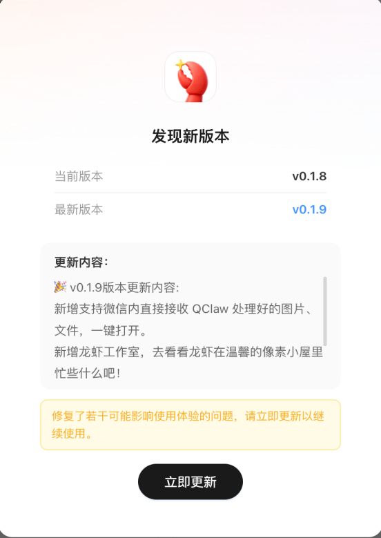 3月18日,腾讯QClaw宣布了一项重要的版本更新。新版本(V0.1.9)将微信接口从“客服号”升级为“小程序”,用户可以直接通过小程序接收来自电脑端的文件。此外,该版本还推出了“灵感广场”,预设了一系列场景化常用任务和技能,进一步简化了“养虾”的过程。