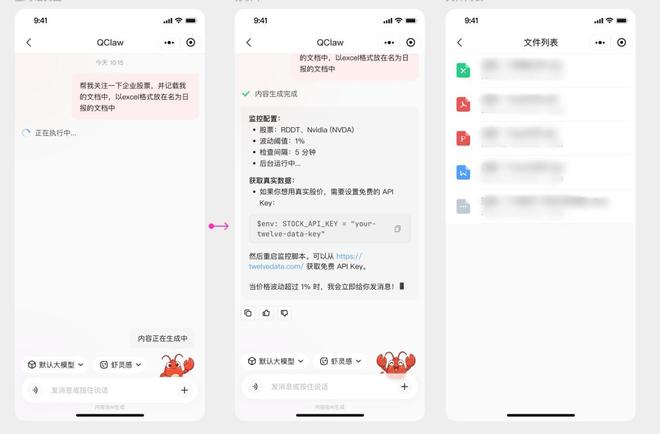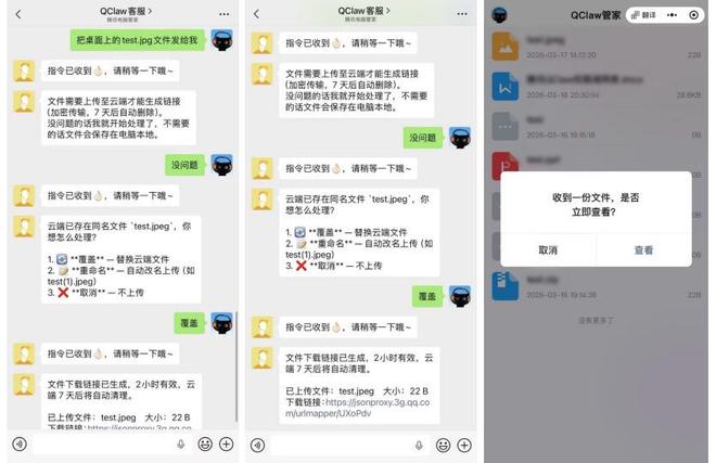 此次更新中,QClaw增加了小程序文件传输功能,用户可以通过客服号操控QClaw将电脑端的文件发送至小程序。据透露,未来QClaw小程序还将支持语音和图片传输等更多微信原生的多模态交互能力,使用户与“龙虾”的互动更加便捷。