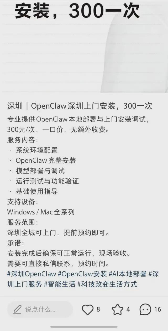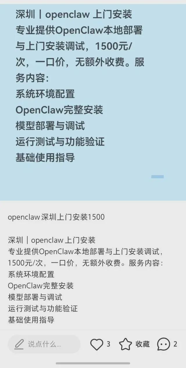 目前,在国内社交平台上可以轻易找到提供“OpenClaw上门安装调试”服务的信息。收费标准从远程安装的300元起步到上门服务的500元至1500元不等,这些服务包括本地部署、运行调试和基础使用指导。