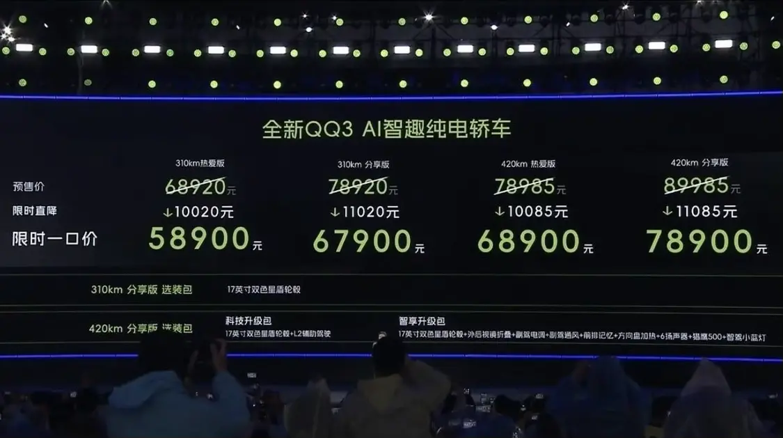最近,奇瑞公司推出了一款全新的电动车型QQ3,并宣布了限时优惠价格为5.89万至7.89万元人民币,提供了四种不同的配置选择。这款新车配备了先进的AI灵犀座舱和猎鹰500辅助驾驶系统。