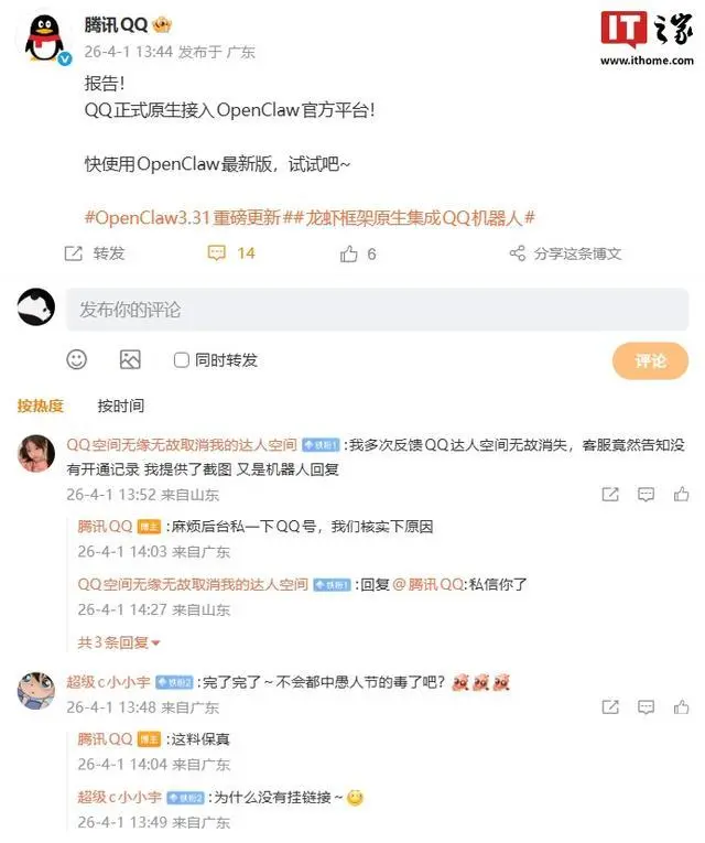针对有用户质疑这一消息的真实性,腾讯 QQ 回应称:“这绝非愚人节的玩笑。”同时透露,升级至 OpenClaw v2026.3.31 版本后即可在 QQ 上实现养龙虾的功能。