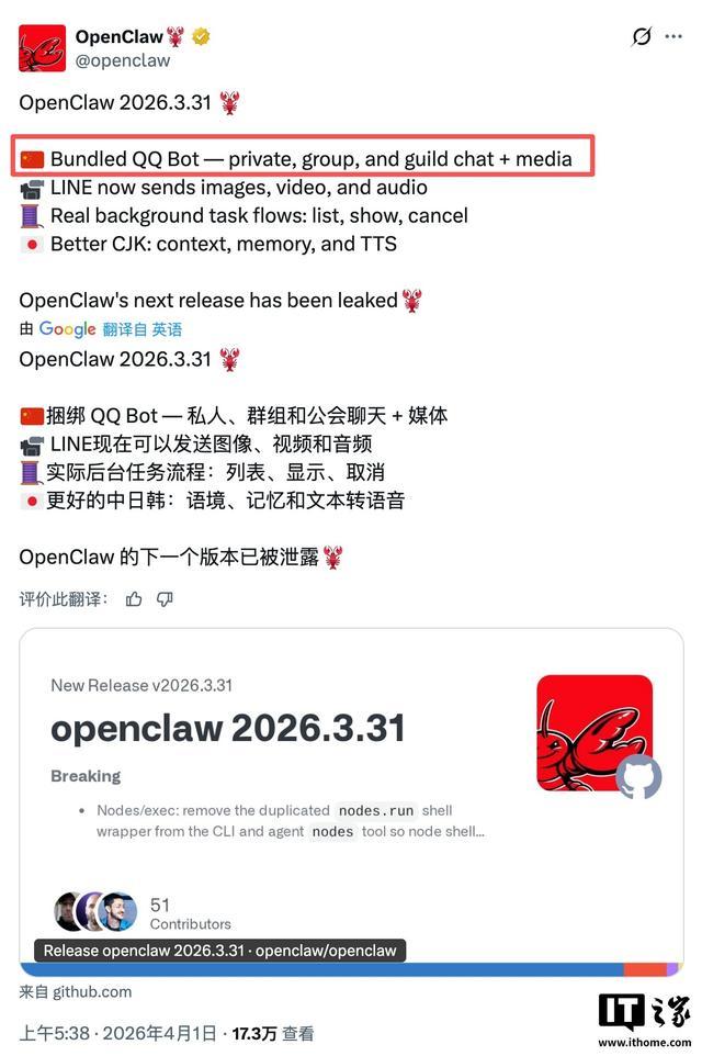 据相关报道,AI 智能体及自动化框架 OpenClaw 最近发布了新版 v2026.3.31。根据更新记录,此次主要改进之一便是将腾讯 QQ 机器人作为内置插件进行了原生集成。