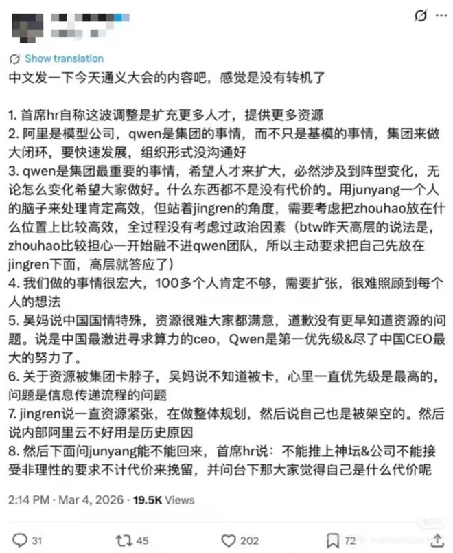 坚固的堡垒都是从内部击破的。如果事情已无可挽回,作为Qwen开源模型的忠实用户和支持者,城主希望Qwen团队继续扛住大旗,别浪费了好不容易才打造的大好局面。而对于阿里组织内部,如果高层固执地认为这只是一次走向商业化必经的‘组织阵痛’,那这代价未免也太惨痛了些。 Qwen终究还是能扛住风波继续向前,但这依然是阿里自己给自己平添的一个毫无必要的打击。