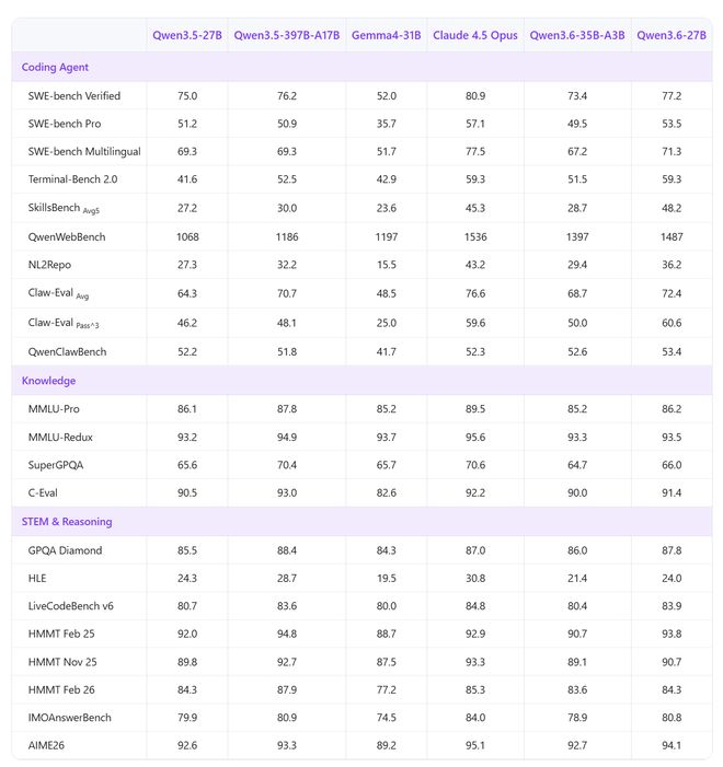 与同级别的Gemma 4-31B模型相比,Qwen3.6-27B在诸多重要领域展现出了更强的优势。