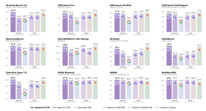 在编程基准测试中,Qwen3.6-27B显著超越了其前辈。例如在SWE-bench Verified(77.2 vs. 76.2)、SWE-bench Pro(53.5 vs. 50.9)、Terminal-Bench 2.0(59.3 vs. 52.5)以及SkillsBench(48.2 vs. 30.0)等测试中,Qwen3.6-27B均展示出了更强的实力。