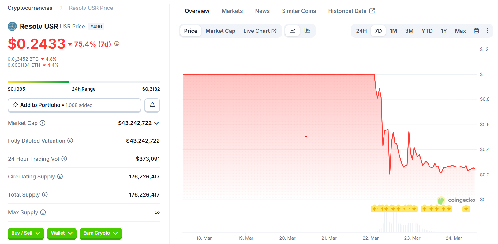 在周日遭受攻击后,Resolv Labs决定暂停其协议。此次攻击导致8000万枚无抵押代币被铸造,进而引发了其美元稳定币的严重脱锚,币价最低时跌至0.14美元。