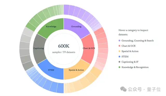 这个多样化数据集包括图表与OCR、空间与动作、知识与识别等多种类型的任务。