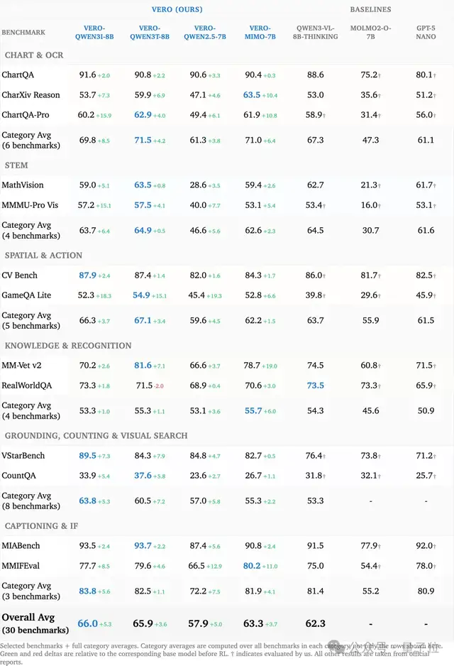 实验结果显示,在没有引入任何私有“思考”数据的情况下,基于Vero训练的模型在30个基准测试中的23项上,超越了经过专门微调的Qwen3-VL-8B-Thinking。