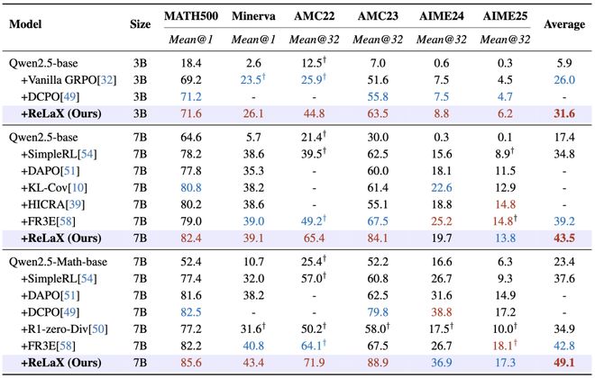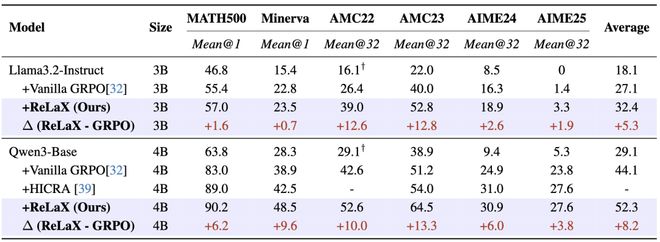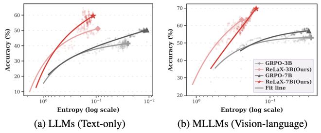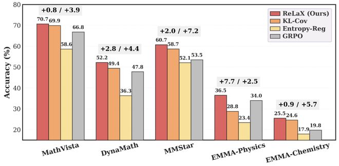 研究人员在纯文本和多模态视觉-语言大型模型上测试了ReLaX的效果,并与GRPO进行了对比。