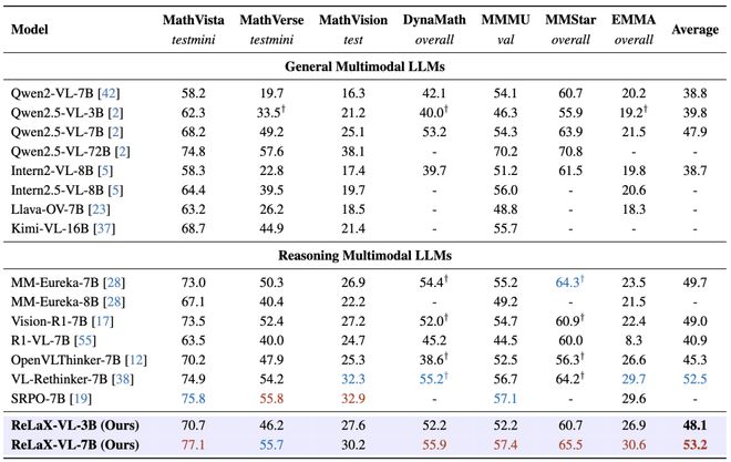 ReLaX在多模态推理任务上取得了显著成就:7B规模模型在多个基准测试中达到了53.2%的平均准确率,打破了同尺度模型性能记录。而较小规模(3B)的ReLaX也展现了强大的竞争力,甚至超越了一些更大的模型。