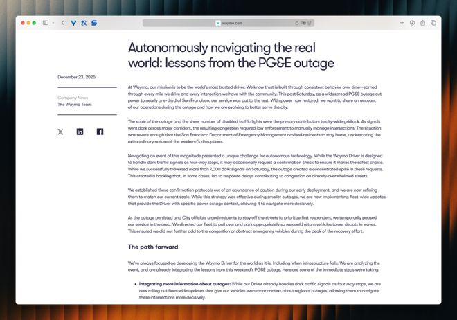 无论是在此竞赛中哪一方的一次短暂停顿都不值得被过度放大。Waymo 在大规模停滞后的第二天就恢复了旧金山地区的正常服务,并且近期还开通了往返旧金山国际机场的客运服务。