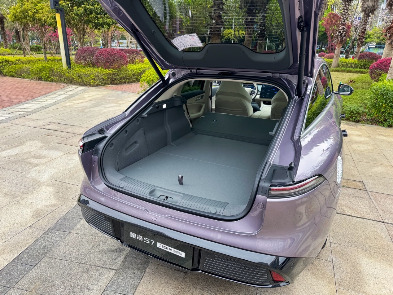 星海S7增程版的尾门采用了掀背式设计,既美观又实用。尾门开口大,内部空间规整,放置大件物品非常方便,还配备了电动尾门,增加了使用的便利性。