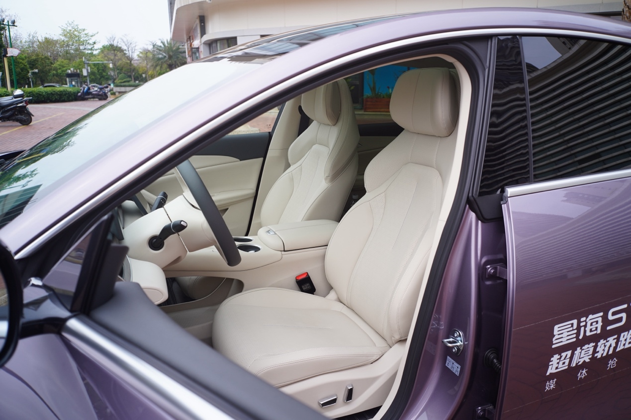 在空间表现上,星海S7增程版不仅后备厢储物能力出色,车内乘坐体验也颇具亮点。后排腿部空间十分宽裕,且得益于接近全平的后排地台,中间乘客的舒适度有所提升。座椅设计方面,星海S7增程版的座椅角度经过优化,末端微微上翘,能为腿部提供良好的支撑。前排座椅下方也进行了掏空设计,增强了后排乘客的脚部活动空间。此外,座椅的填充物支撑性不错,头枕采用了航空座椅同款可弯折设计,在舒适性方面的表现超出预期。