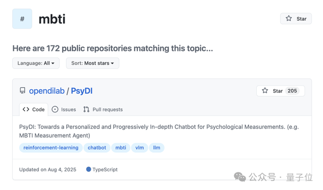 不仅如此,它甚至还在GitHub上带火一些xxTI字辈儿的开源项目,给大家小小科普一下,目前单MBTI topic底下,就有172个公开仓库…