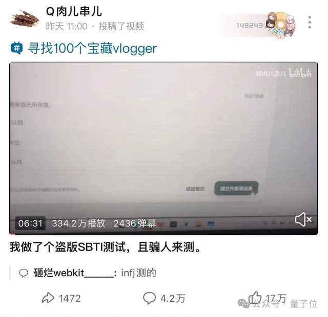 有趣的是,这款火遍全网的人格测试是由B站UP主Q肉儿串儿开发的。