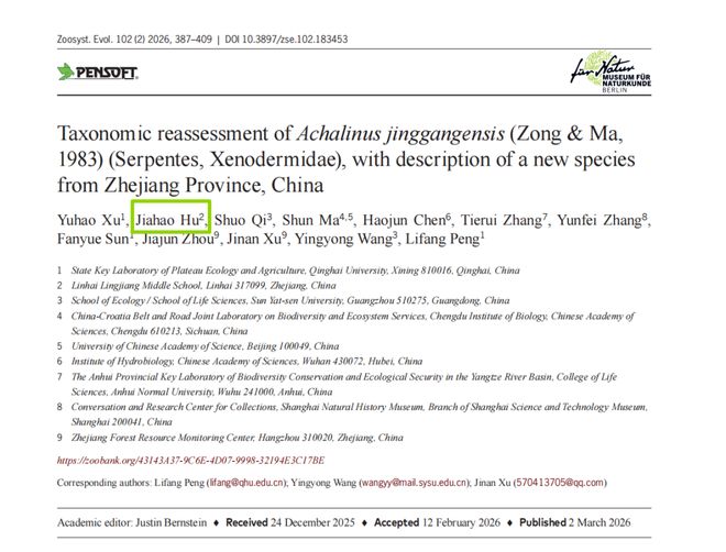 3月3日深夜,来自浙江临海的一名高三学生胡家豪在个人社交媒体上分享了他的一项重大发现——一种新的爬行动物物种:括苍山脊蛇。这篇论文发表于国际期刊《Zoosystematics and Evolution》。