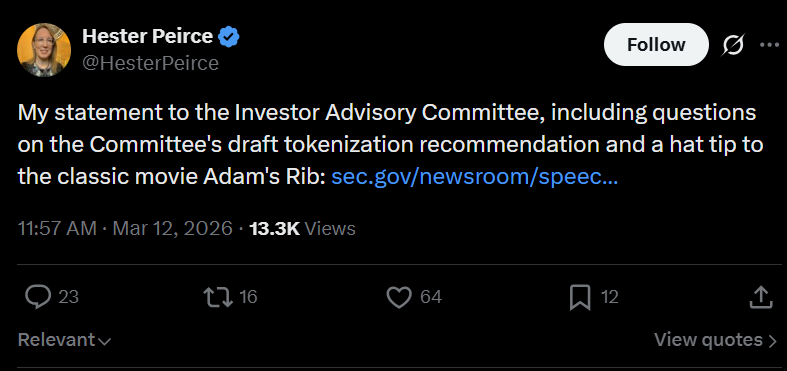 虽然演讲中涵盖了广泛的监管议题,Peirce还特别提到了围绕代币化证券和区块链基础设施的争论正变得越来越激烈。