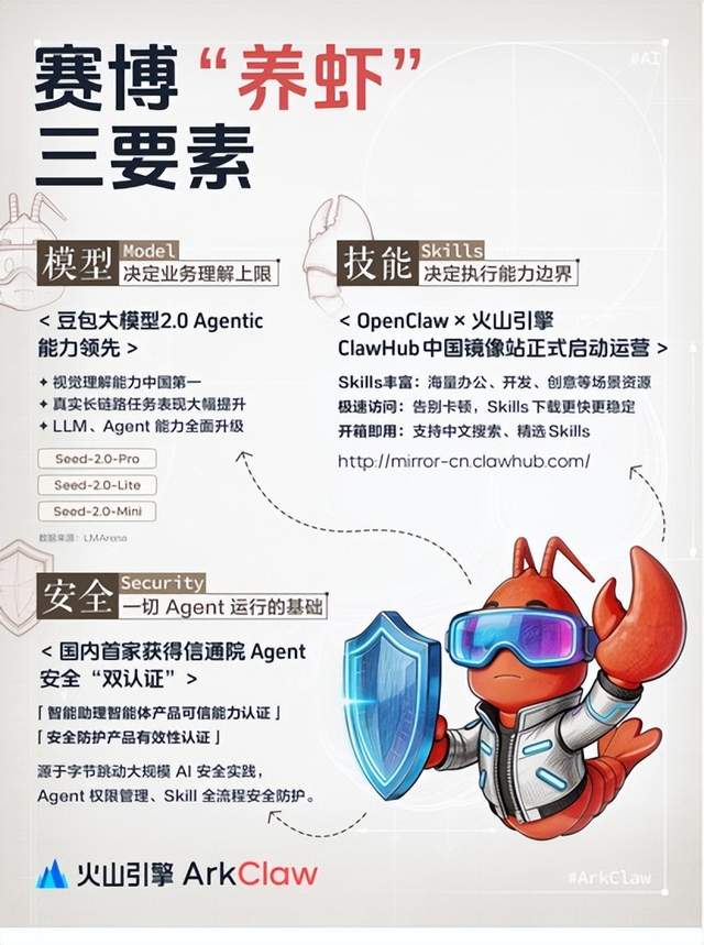 谭待进一步指出,企业在使用龙虾类智能体服务时需要关注的三个关键因素包括模型本身的能力水平、安全性能以及Skills的应用。最新的豆包大模型2.0版本在多模态理解和复杂任务执行等方面已经取得了显著进展,并且在全球范围内处于领先地位。此外,在安全性方面,火山引擎刚刚通过了中国信息通信研究院关于龙虾类产品“智能助理智能体产品可信能力认证”和“安全防护产品有效性认证”,成为当前唯一一家同时获得这两项资质的企业。