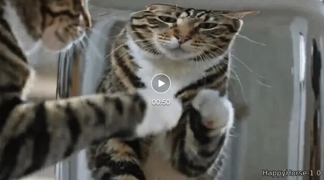 提示词:一只猫盯着镜子中的自己,爪子轻拍着铬镜面。反射出的猫咪也模仿动作,发出困惑的声音。音频:猫爪拍打、疑惑的叫声。