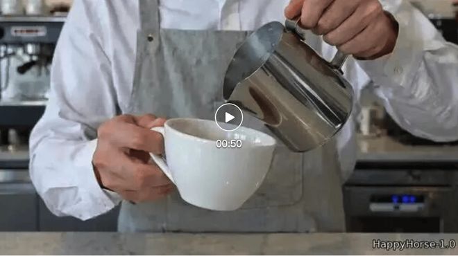 提示词:一位咖啡师正在制作拿铁艺术,在浓缩咖啡上倒入蒸汽加热的牛奶。最开始白色牛奶沉入棕色泡沫下,随后冲破表面直到杯子填满为止。咖啡师的手腕精准摆动,形成一朵玫瑰花图案。两种液体保持各自颜色,相互交融在边界处。音频:液体制作的声音、蒸气喷嘴背景声。