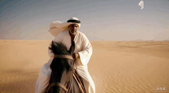提示词:远景:一位身着阿拉伯白袍的骑手骑着黑色骏马在广阔的金色沙漠中疾驰,马蹄扬起漫天黄沙。镜头从极远的距离快速推近,逐渐看清骑手被风沙吹拂的面容和飘扬的头巾。他用力拉紧缰绳,马匹前蹄腾空,发出嘶鸣。夕阳在他身后形成巨大的光晕。4K,电影质感。
