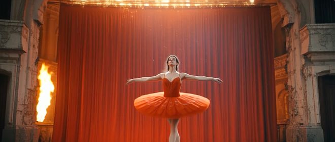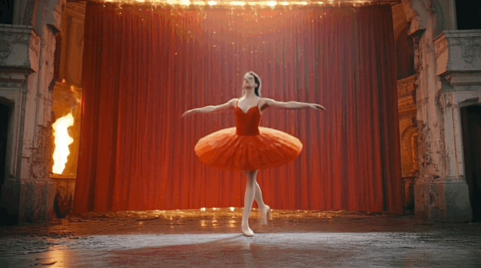 这是对光影处理能力的测试,玻璃幕墙既是反射面又是透光面,需要在倒影和透射之间找到精确平衡。生成视频中,人物贴近玻璃时,面部与晚霞的反射亮度略低于实体,且随镜头推近保持比例一致,没有出现常见的“反射滞后”或“反射变形”。