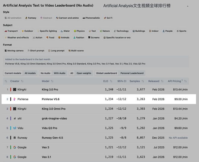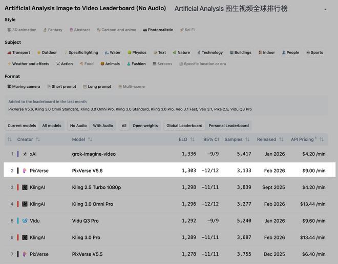 2月26日,全球权威AI评估机构Artificial Analysis更新了文生视频/图生视频模型排行榜。国内头部AI视频生成企业爱诗科技旗下的PixVerse V5.6位列全球第二,把国产模型的“写实能力”推上新高度。