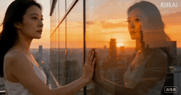 提示词:一位身穿白色连衣裙的亚洲女性站在城市高空玻璃幕墙前,夕阳的余晖洒在玻璃上,反射出暖橙色的光芒。她轻轻将手掌贴在玻璃上,玻璃上映出她清晰的面容和身后的晚霞。镜头缓慢推近,聚焦她眼中倒映的城市轮廓。4K,电影感光影,皮肤质感细腻。