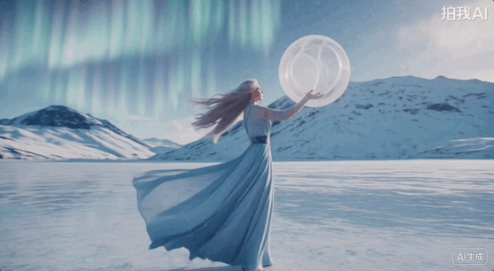 提示词:一位穿着冰蓝色长裙的银发女子站在冰封的湖面上,双手抬起,掌心凝聚出旋转的冰晶风暴。雪花围绕她飞舞,她的长发和裙摆随风飘动。背景是极光和雪山,冰面反射出她的身影和极光。镜头围绕她旋转,捕捉冰晶在阳光下折射的七彩光芒。