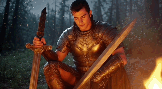 提示词: 一位身披金属铠甲的古希腊战士坐在夜晚的篝火旁,火焰跳跃,照亮他棱角分明的脸庞和铠甲的凹凸纹理。他低头凝视手中的古老铜剑,剑身映出跳动的火焰。背景是黑暗的森林,火星随风飘向夜空。特写镜头从火焰切换到战士的眼睛,瞳孔中倒映着篝火。
