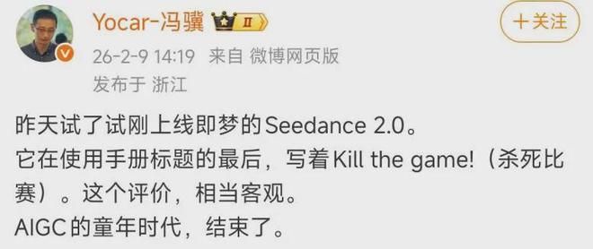 在游戏科学CEO冯骥看来,Seedance 2.0确实如其所言,是一个“杀死比赛”的存在。他直接给出了“当前地表最强的视频生成模型”的超高评价。