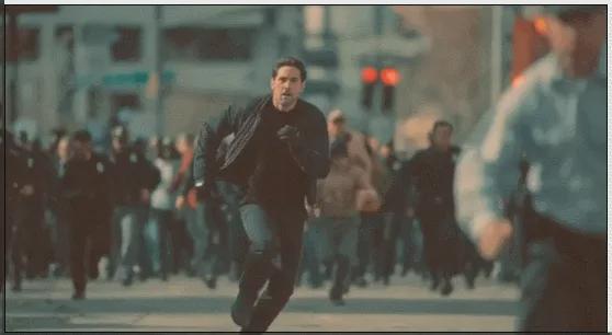 在一段极具张力的慢镜头之后,男子挣扎起身,继续被四名警察追逐。