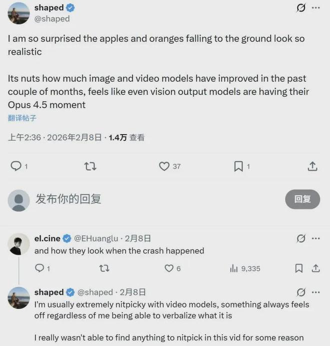 美国AI训练数据初创公司Parsewave的联合创始人在观看后惊叹:“我太惊讶了,苹果和橙子掉落在地上的效果看起来如此逼真……我对AI视频向来极其挑剔,但这个片段,我真的挑不出任何毛病。”