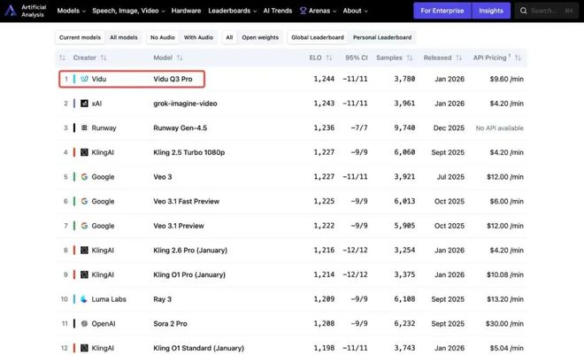 在国际权威AI基准测试机构Artificial Analysis 最新公布的文生视频模型榜单中,Vidu Q3排名全球第一,超越马斯克xAI Grok,Runway Gen-4.5 ,Google Veo3.1和 OpenAI Sora 2等一众厂商。