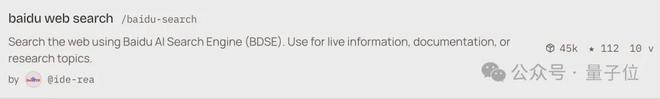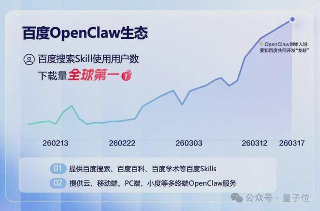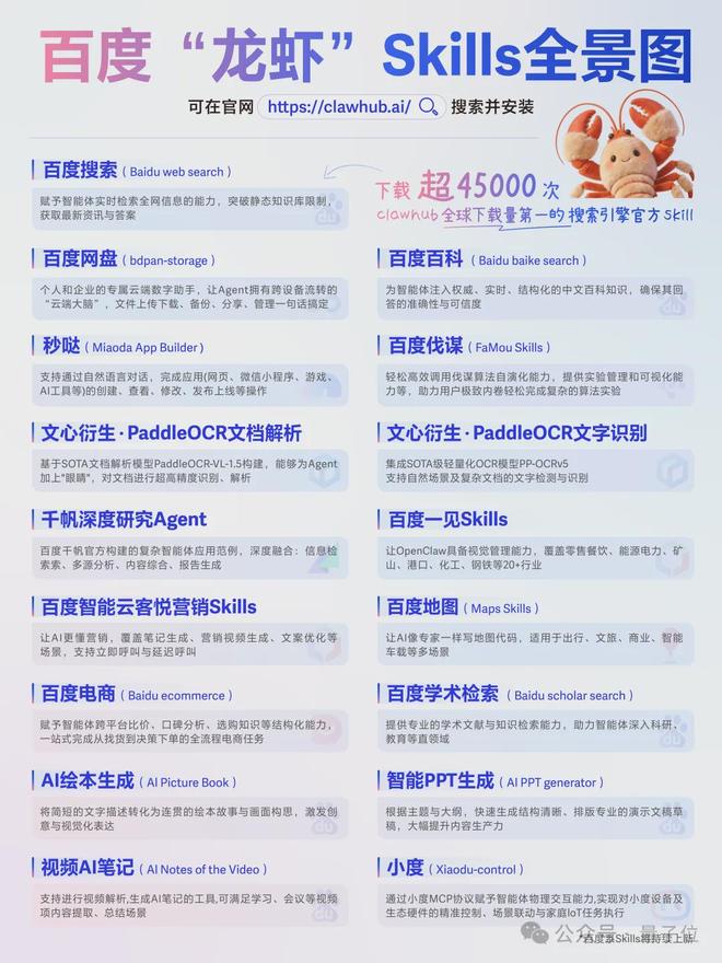 其中百度搜索Skill下载量超4.5万次,是全球下载量最大的搜索引擎官方Skill,成为「龙虾必备」。