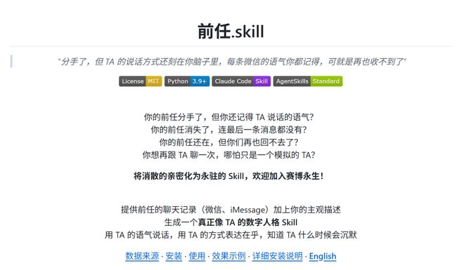 比如这个「前任.skill」 ,甚至贴心地推出了「微信聊天记录全自动导入」功能。