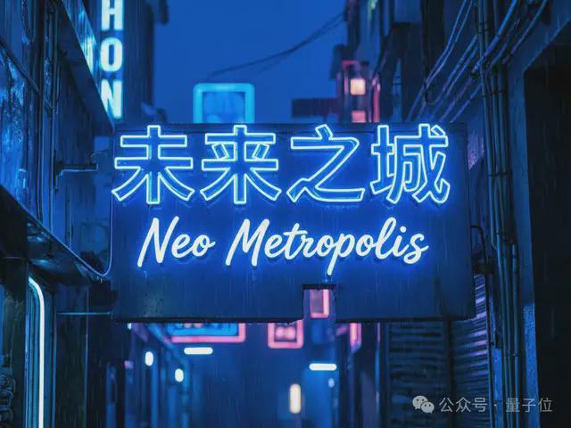 此外,Wan2.7-Image还能进行调色处理,例如为一张赛博朋克风格的夜景照片设定主色调为蓝色RGB(0, 70, 255)。画面聚焦在发光霓虹招牌上,上面用汉字写着“未来之城”,下方则是手写英文“Neo Metropolis”。