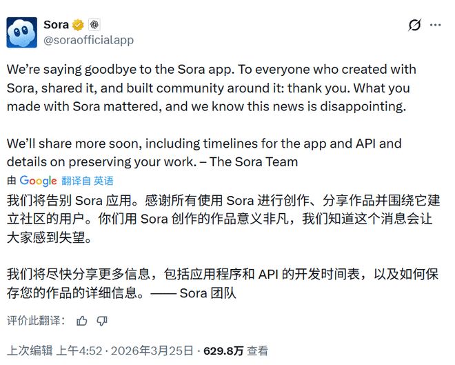 OpenAI在社交平台X上发布了一条消息:“Sora,再见了。感谢每一位用Sora创作、分享以及建立社区的人。你们通过Sora创作的内容意义深远,我们理解这一决定令人失望。不久之后,我们将提供更多详情,包括应用程序和API的停运计划,以及如何保存你们作品的信息。”