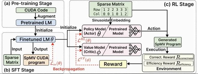 首先,传统监督学习只关注代码的正确性,而忽略了执行效率。对于相同的稀疏矩阵,可能存在多种正确的 CUDA 实现,但执行速度可能相差数倍,监督学习无法区分这些差异。