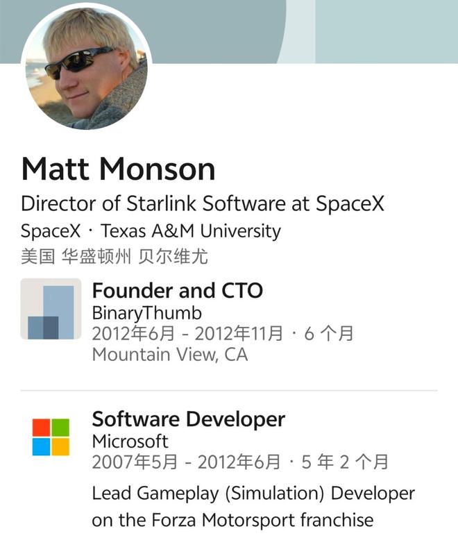 重组调整的计划中,有多名SpaceX员工同时在xAI担任管理职务,比如SpaceX的Starlink软件总监马特・蒙森(Matt Monson),将兼任xAI数据部门负责人。加入SpaceX前,他曾在微软旗下顶级赛车游戏IP《极限竞速》(Forza Motorsport)系列游戏的核心玩法(仿真模拟)担任首席开发工程师,负责赛车物理引擎、车辆动力学仿真等核心技术开发。