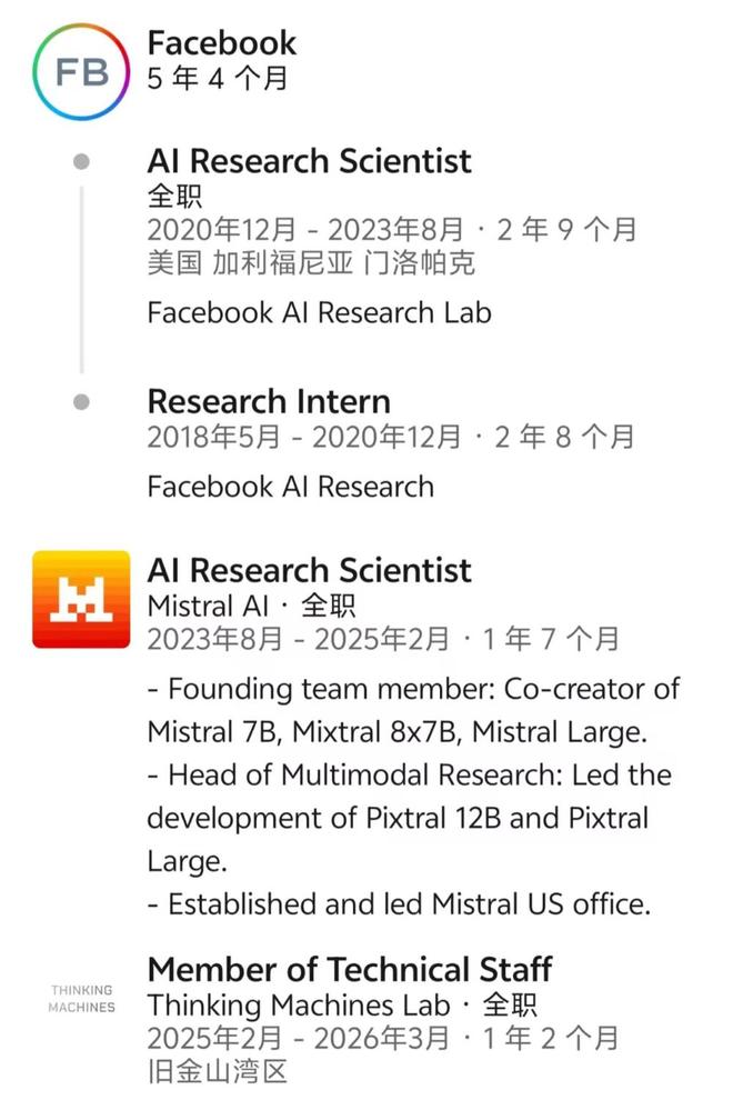 Devendra Chaplot是最近加入xAI的研究人员之一,在此之前他曾供职于Facebook,并且作为Mistral AI公司的创始成员参与开发了多个大模型核心版本。离开Mistral之后,他加入了Thinking Machines Labs从事技术研究工作。