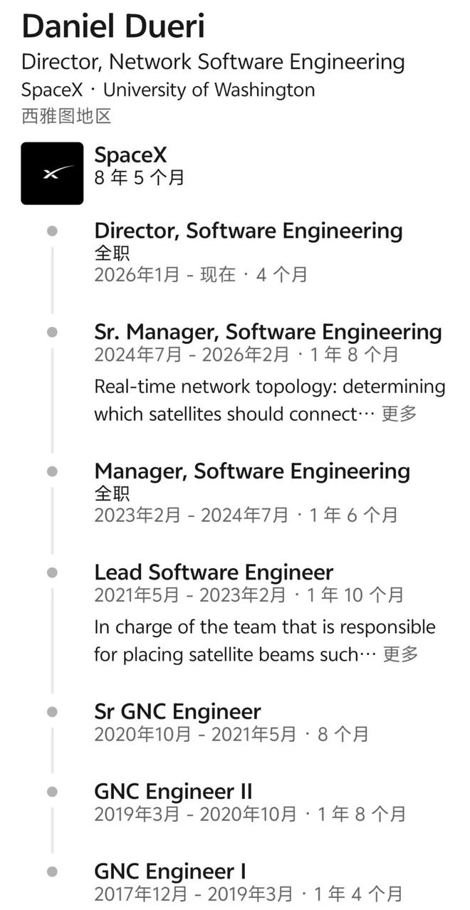 ▲丹尼尔・杜里(Daniel Dueri)在SpaceX的经历(图源:领英)