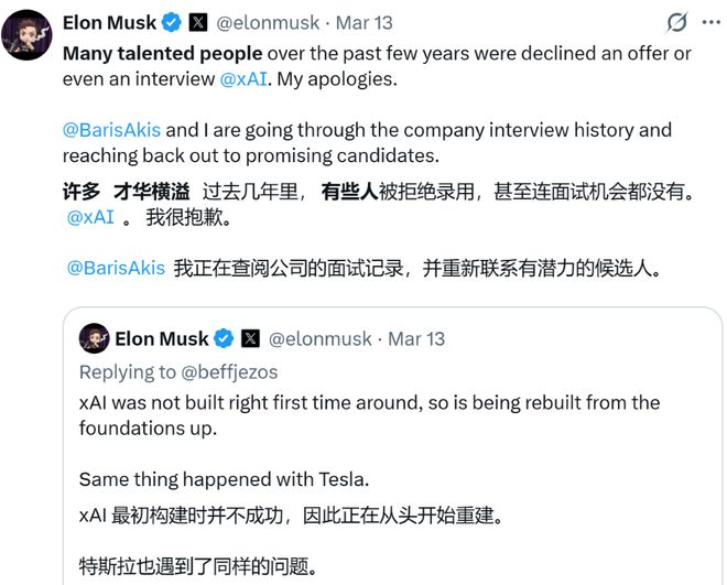 马斯克在3月宣布了对公司“从头开始重建”的计划,称自成立以来公司建设存在根本性缺陷。为了快速补充人员,他还公开向之前被拒的人才致歉,并重启招募程序联系先前落选的优秀候选人。