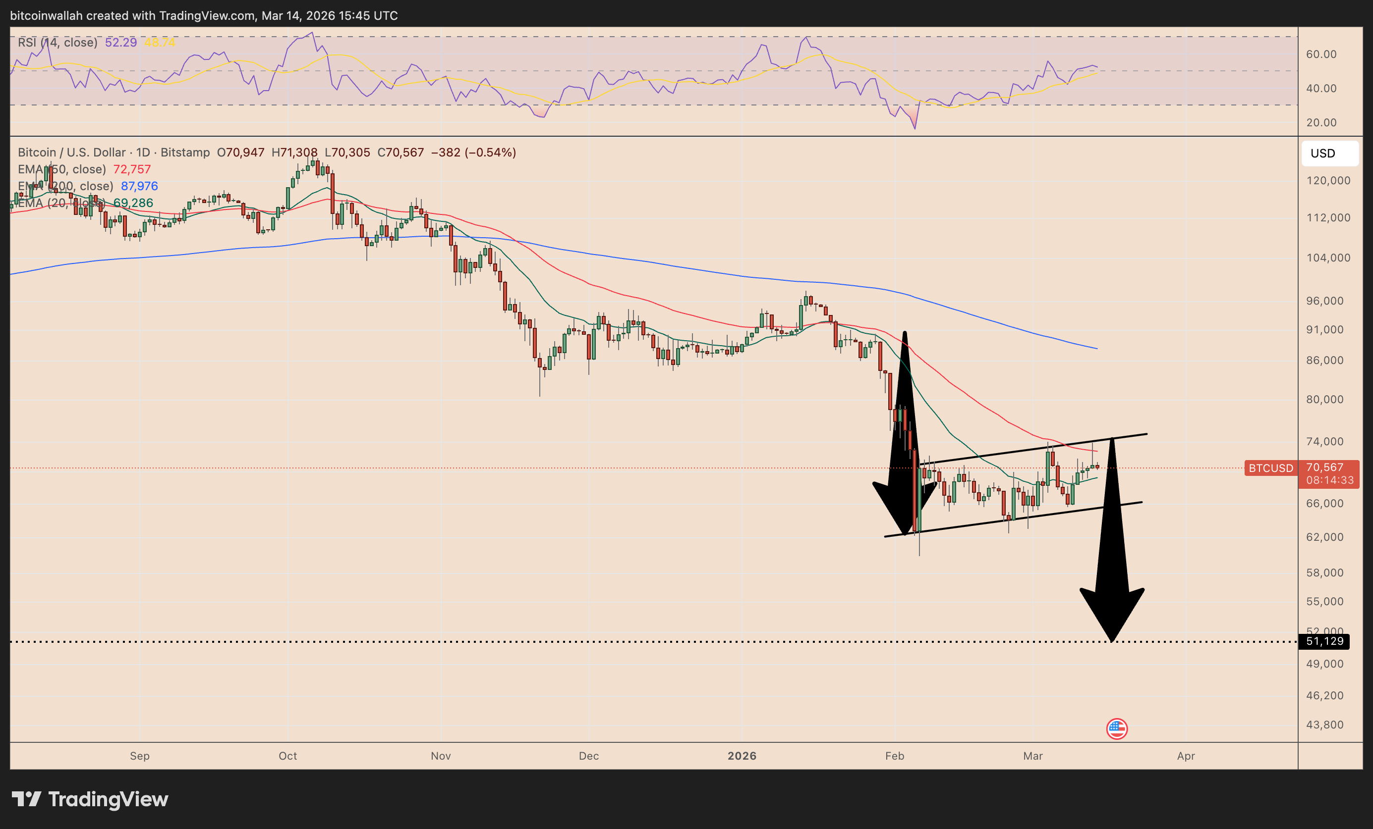 根据空头旗形分析,比特币的下一个关键支撑位在51000美元一线。