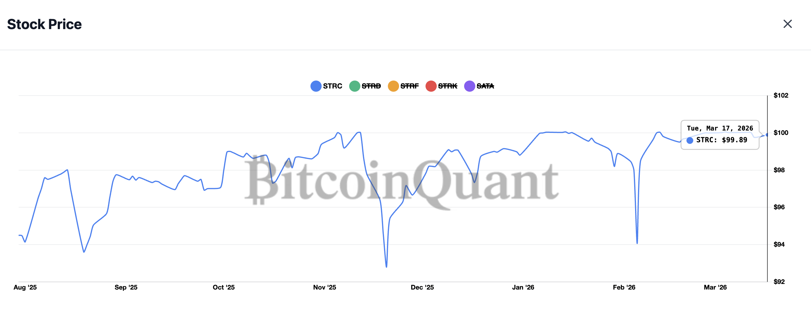 暂停购入比特币的行为与STRC跌破100美元面值同时发生,后者是Strategy按市价(ATM)发行模式的一个重要门槛。