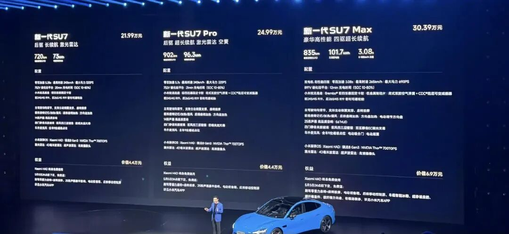 新一代SU7的售价分别为标准版21.99万元、Pro版24.99万元以及Max版30.39万元,相比前一代车型上涨了4000元,但此次全系标配了800V高压平台和激光雷达,最高赠送6.9万元的权益,且交车速度最快可一周内完成。