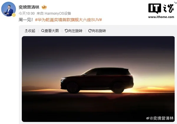 4月17日,社交媒体上出现了一张奕境汽车首款旗舰级六座SUV的预告图,该图由奕境汽车品牌总经理曾清林发布,并预告了这款车型将于下周一(即4月20日)正式揭晓。