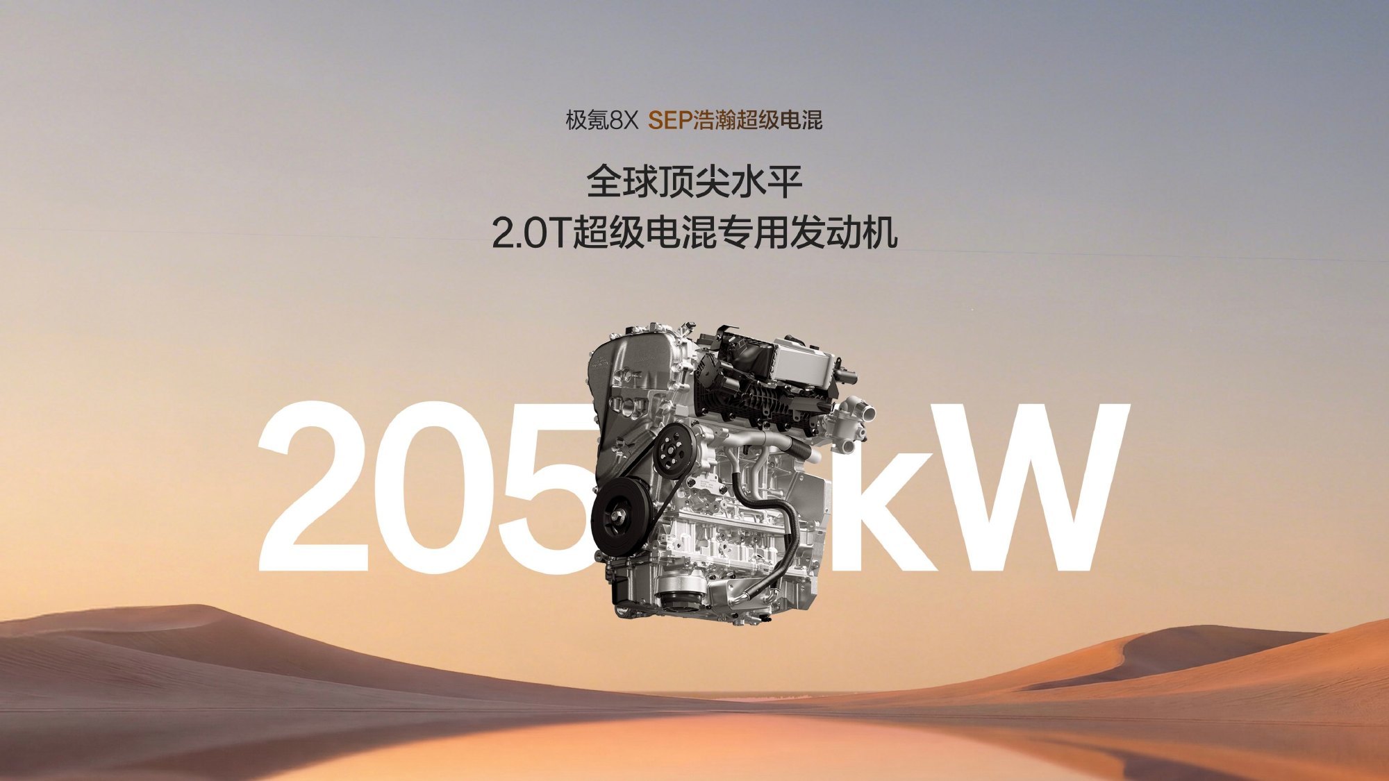 极氪8X基于浩瀚-S超级电混平台设计,采用全栈900V高压技术。该车搭载了首个在混合动力领域使用的三电机兆瓦级驱动系统,最大功率达到1030kW,马力超过1400PS。同时配备了一款同级别中功率最高的增程发电机(145kW)和一台2.0T超级电混专用发动机(205kW)。其中,三电机版本的百公里加速时间仅为2.96秒,而双电机版则需要3.7秒。