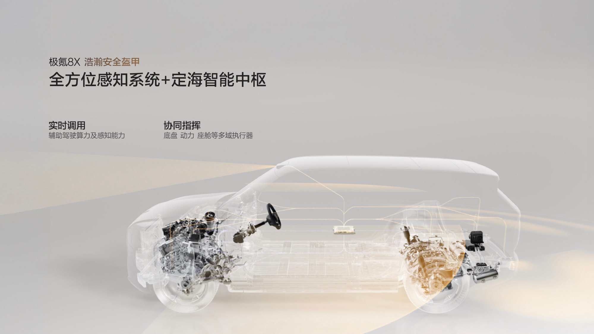 极氪8X首发了一套全新的千里浩瀚G-ASD辅助驾驶系统,最高配置版本包含43个传感器和五个激光雷达,并且配备了双NVIDIA DRIVE Thor-U芯片,提供1400TOPS的车载计算能力。